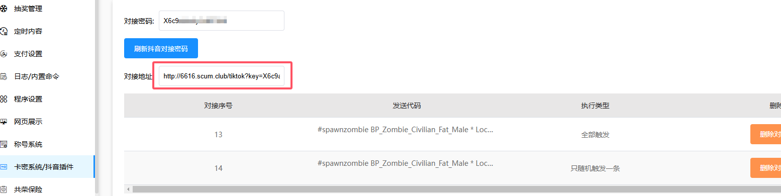 例如填写 http://6616.scum.club/tiktok?key=X6c9a8m0y3d229X8 - 4.编辑礼物及触发的序号【序号从商城后台添加代码后会显示】【允许一个礼物触发多个序号】