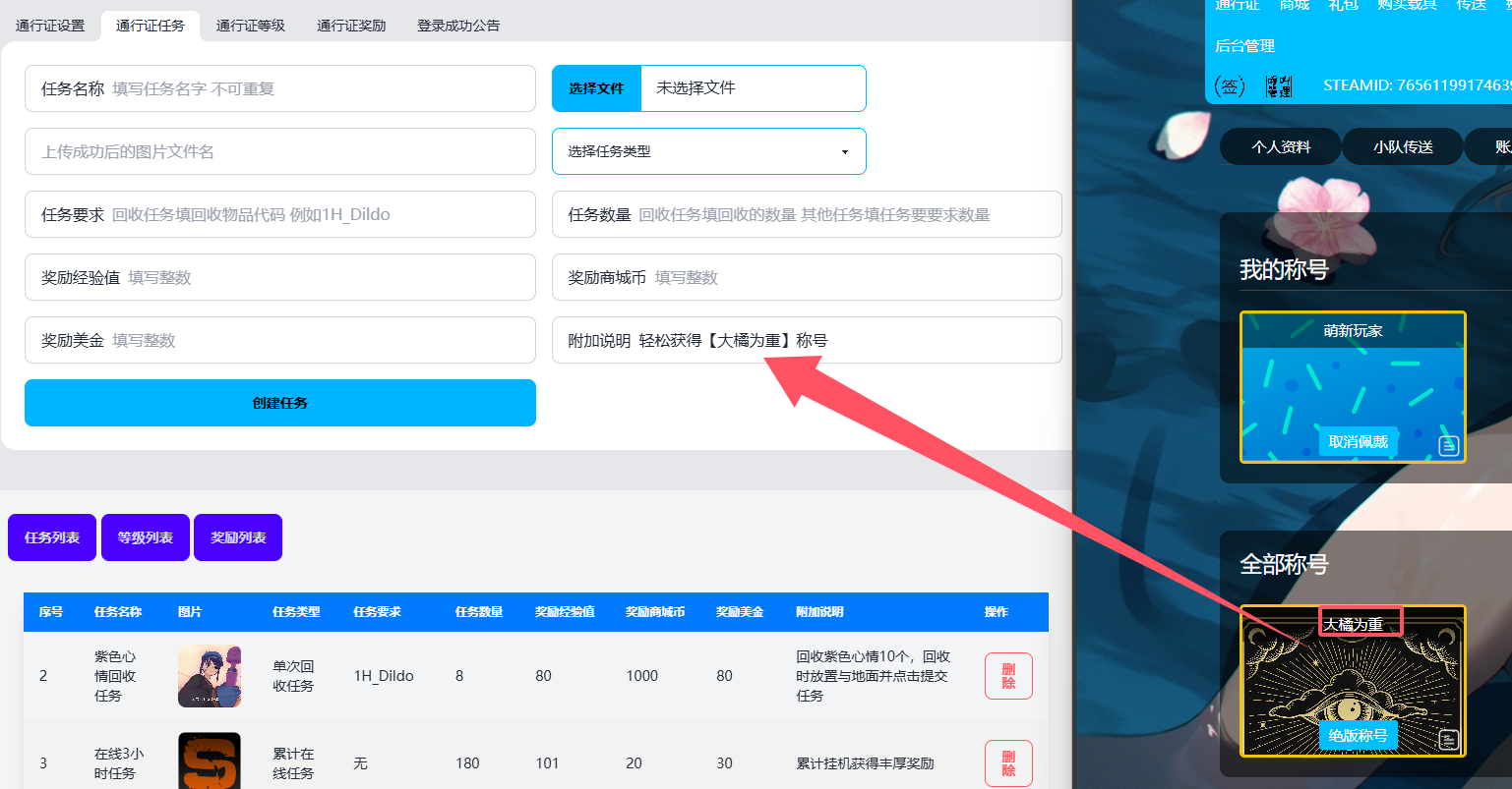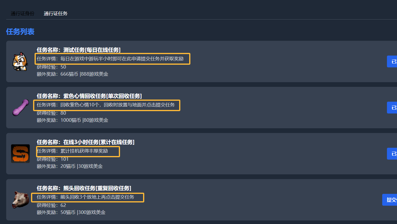 - 附加说明 1.这里写具体的任务需求说明或提示,也支持使用【】将已经创建了的称号放进去,可以用于提交任务成功后获得该称号 2.如果说明中包含有关键词“永久仅限完成1次”,此任务每ID仅限完成1次,即时重置也不会清除该记录